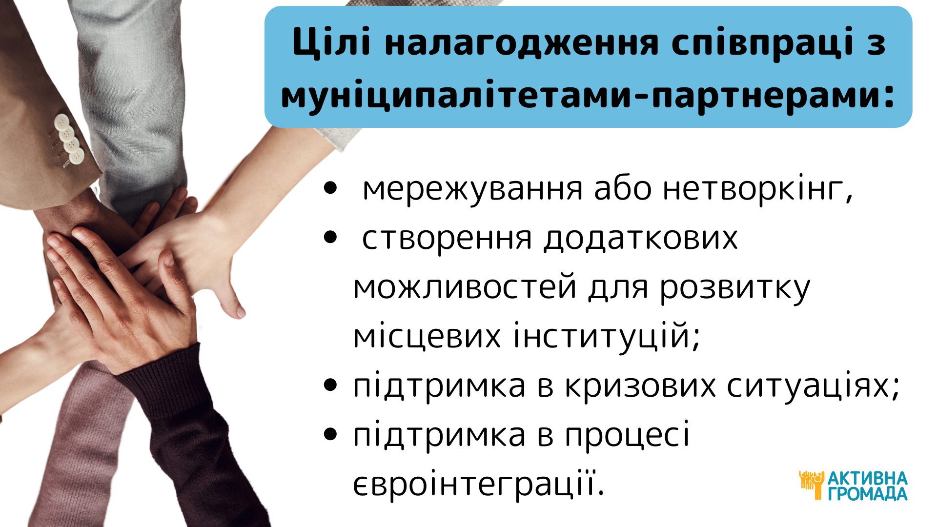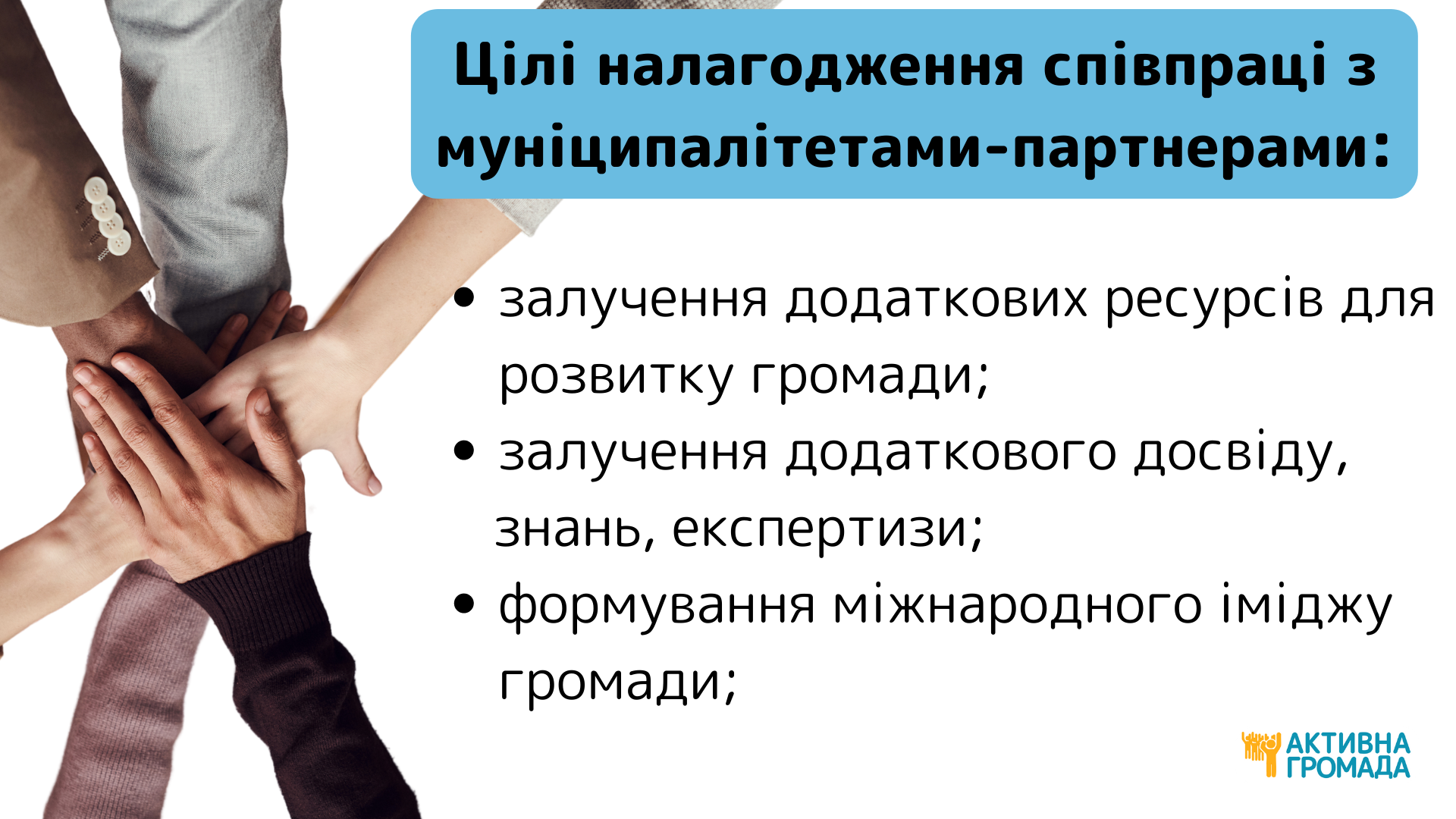 ▪ позиціювання громади як зацікавленої в нових партнерствах (через медіа, соціальні мережі, реєстрацію на платформах для допомоги громадам з пошуку партнерів);