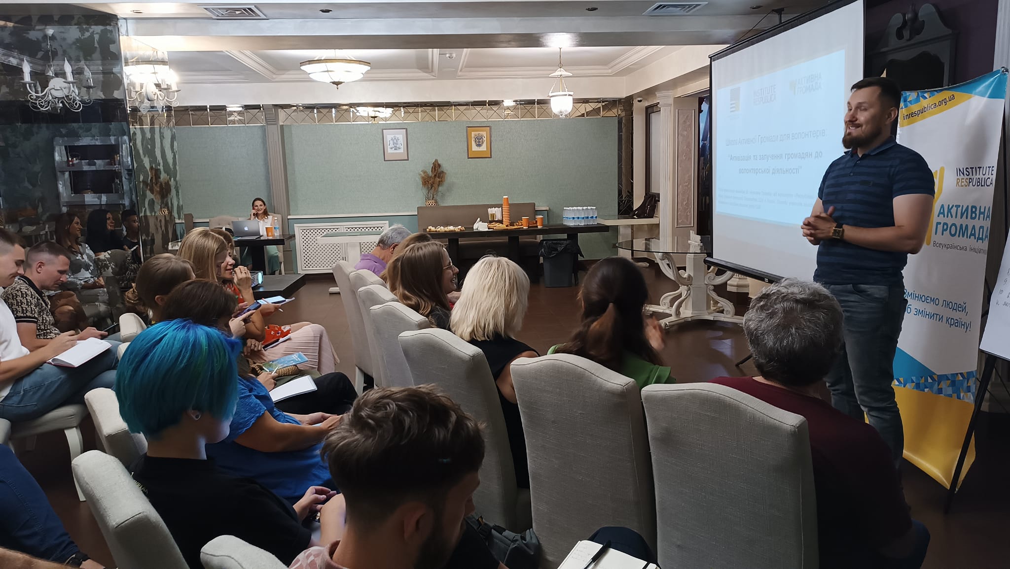 Олександра Гліжинська, виконавча директорка Інституту “Республіка”, засновниця ВІ “Активна Громада”, сертифікований коуч, НЛП-майстер, розповіла учасникам про психологію людей в кризовий період, неконфліктну комунікацію та методи ефективного управління часом. Також разом з тренеркою говорили про залучення фінансування до волонтерської діяльності.